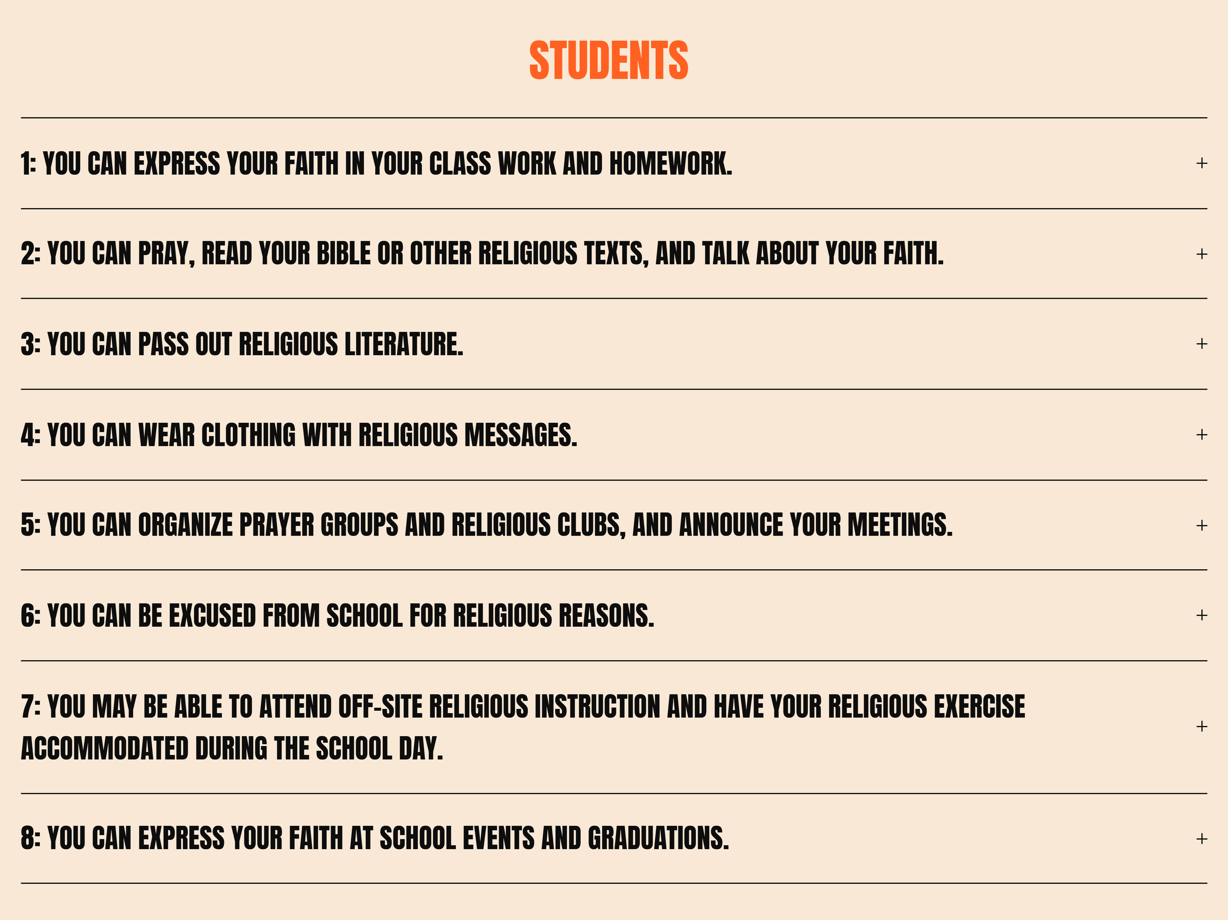Students are scared to live out their faith at school because they don’t know the freedoms that they have to do so. When students know their freedoms and their friends and teachers are made aware as well, they will be set free to be themselves and express their faith.